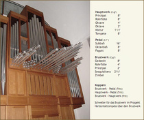 Die Hauptwerkstrompete 8‘ ist in der Prospektansicht der Orgel über der Spielanlage und dem Brustwerk horizontal (nach außen in den Kirchenraum) angebracht.